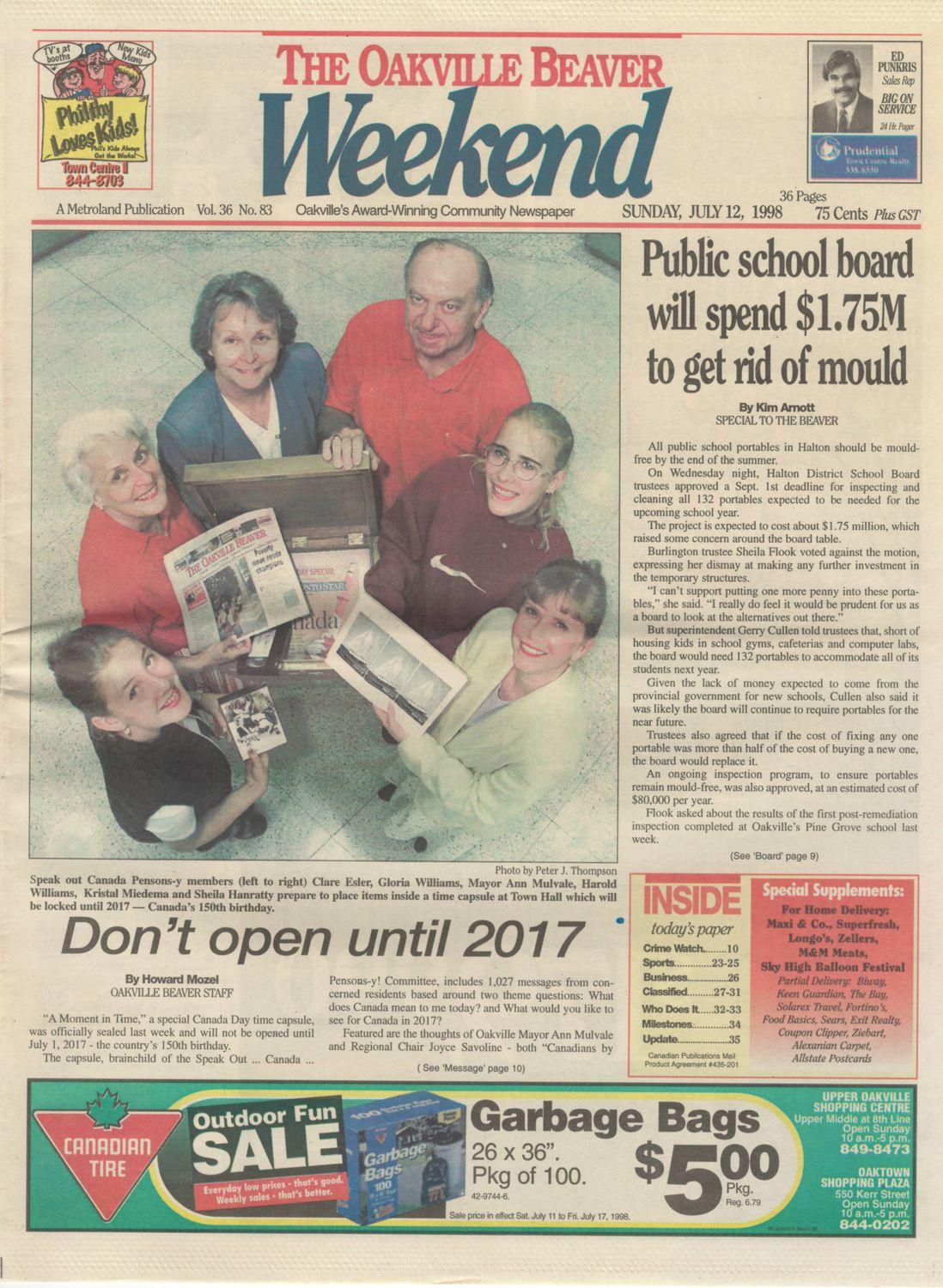 DescriptionCover of the Oakville Beaver Weekend from July 12, 1998; Cover photograph of Speak Out...Canada...Penson-y! members Clare Esler, Gloria Williams, Former Mayor Anne Mulvale, Harold Williams, Kristal Miedema and Sheila Hanratty holding the Time Capsule and items from the capsule with the heading "Don't open until 2017"; "Public school board will spend $1.75M to get rid of mould" is the next headline on the newspaper;