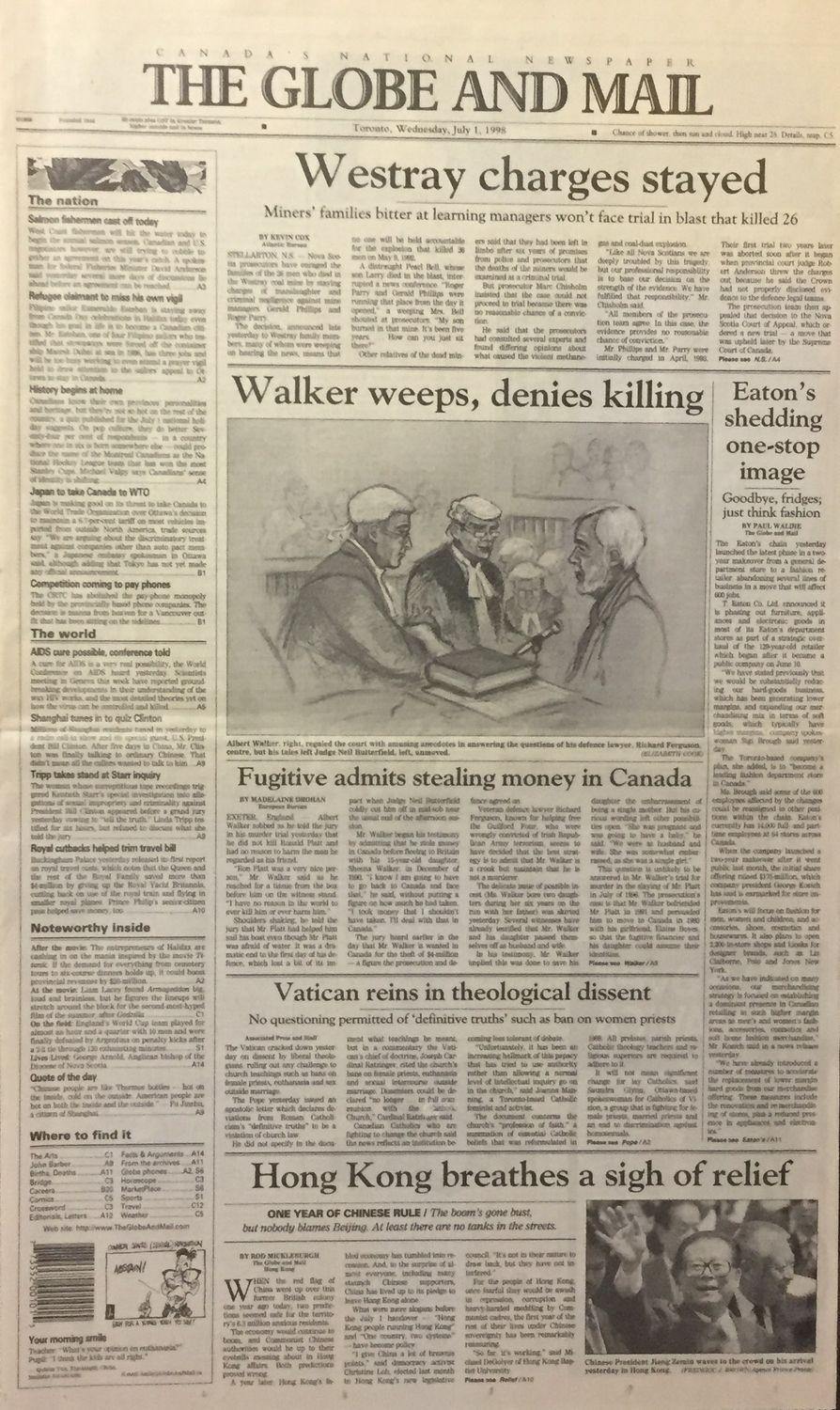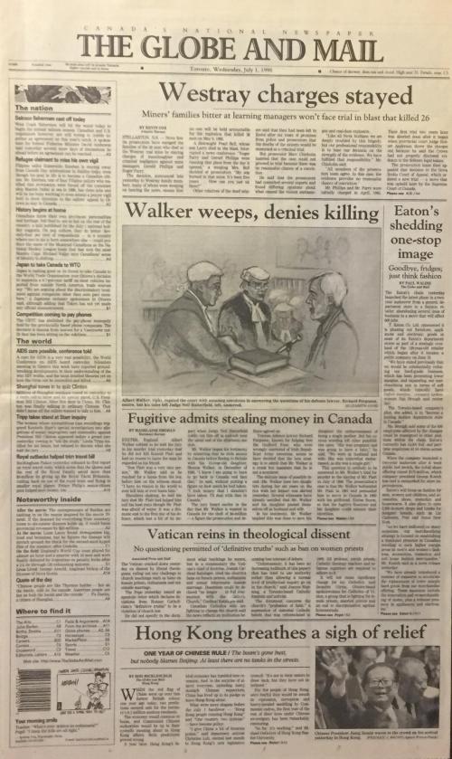 DescriptionCover of the Globe and Mail Newspaper from July 1, 1998; The main cover headline is "Walker weeps, denies killing" with a courtroom sketch; Other headlines include "Westray charges stayed", "Eaton's shedding one-stop image", "Fugitive admits stealing money in Canada", "Vatican reins in theological dissent", "Hong Kong breathes a sigh of relief";