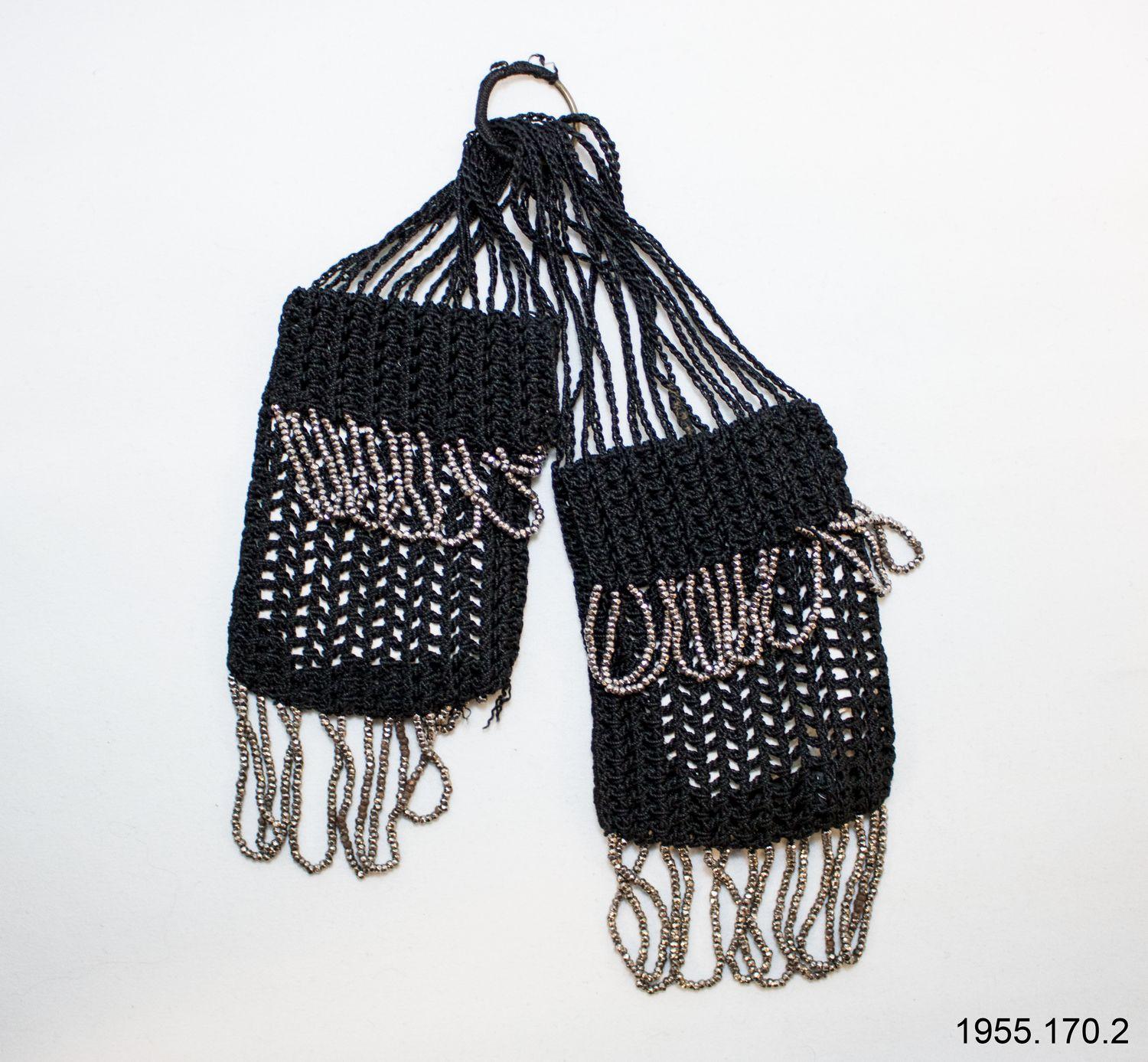 DescriptionBlack silk knitted into two compartments; button holed ring between pouches; base of pouches and flaps edged with steel bead fringe.