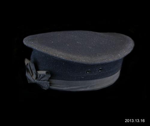 Label text:Royal Canadian Naval hat belonging to Jack Alvin Russell who served on the HMCS Oakville during the Second World War.