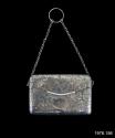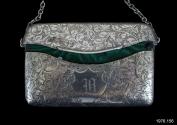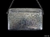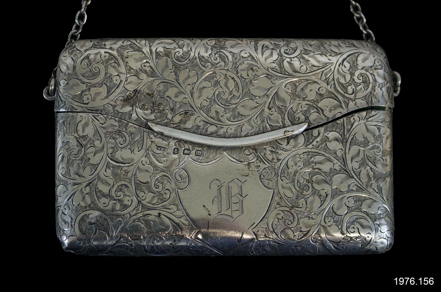 DescriptionSilver card case with engraved floral pattern covering both sides and monogrammed "B" in centre, chain-linked handle.