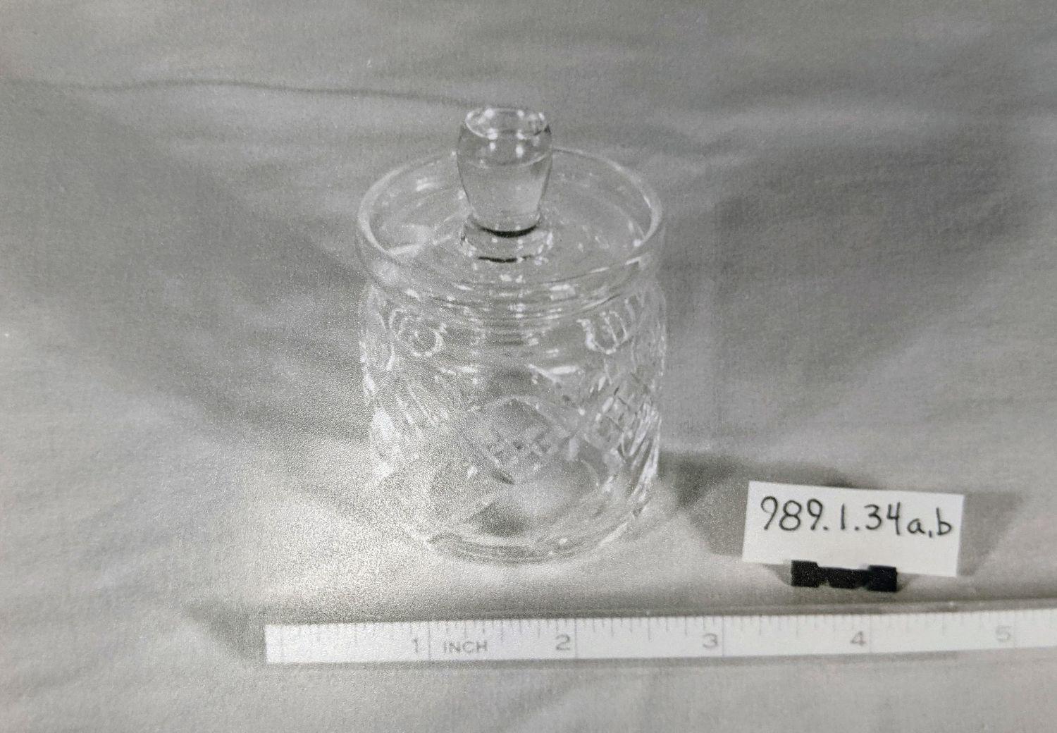 DescriptionSmall crystal mustard pot; cross-cut engraving pot; has a flat lid with round knob and space cut out for spoon; makers' mark on bottom.