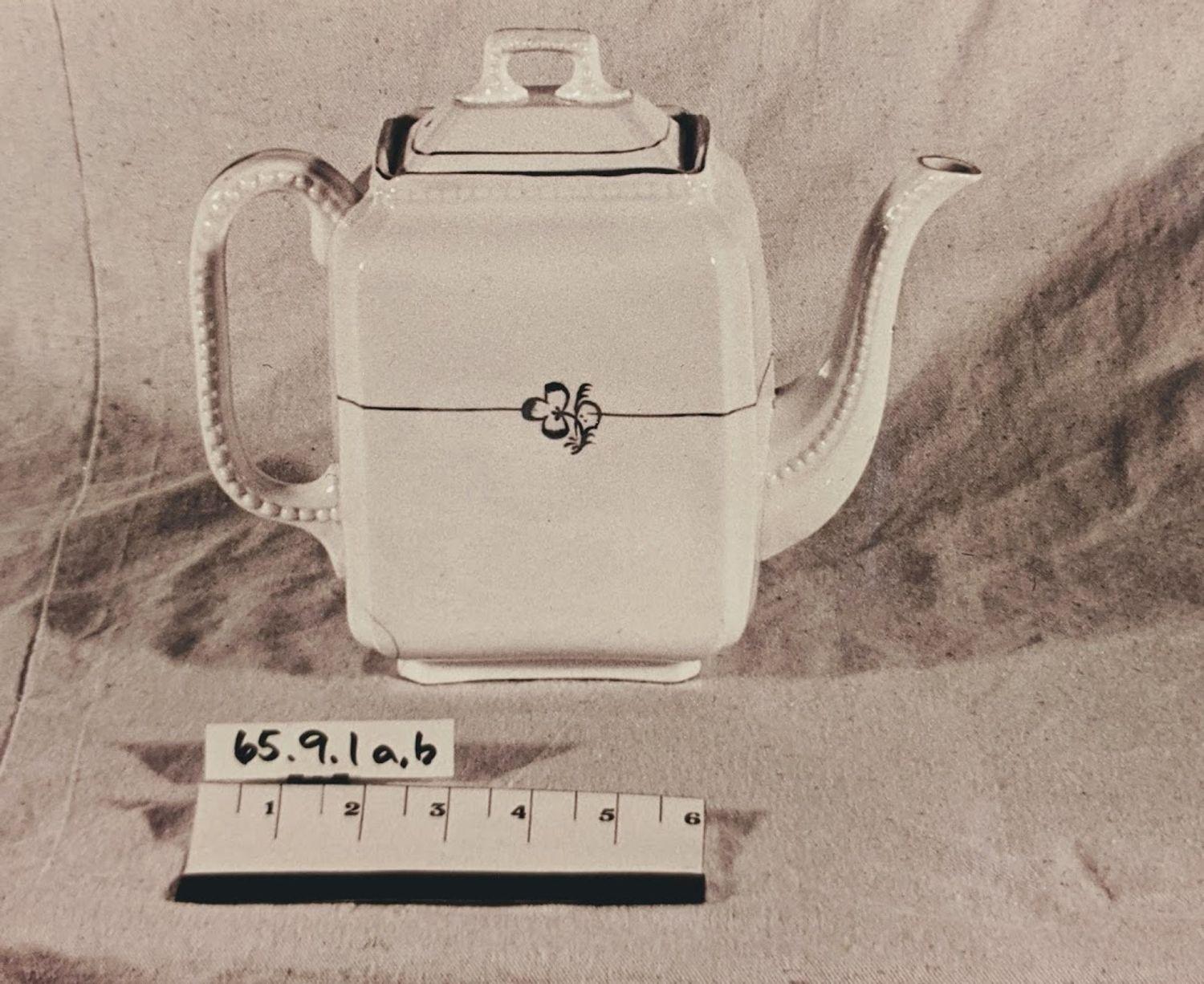 DescriptionChina teapot, white with gold clover leaf decoration and trim; square top and bottom; relief decoration of circles on handle, spout and around rim.