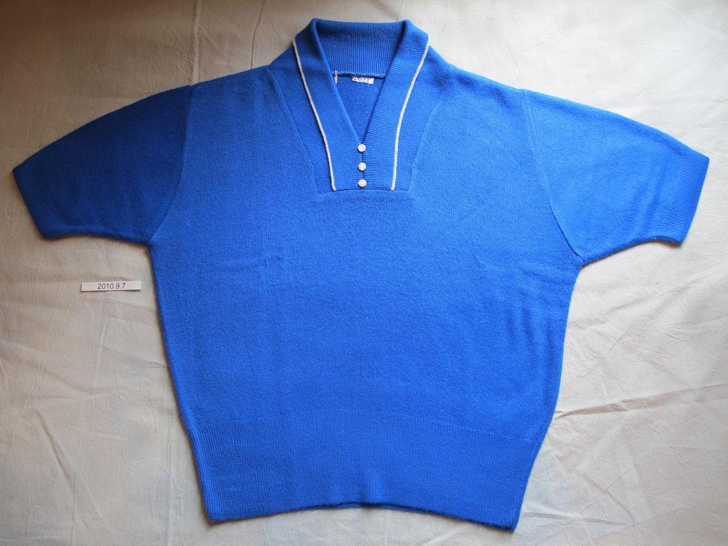 Medium blue short sleeved sweater, white collar folded down, 3 white buttons.