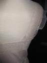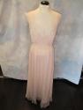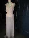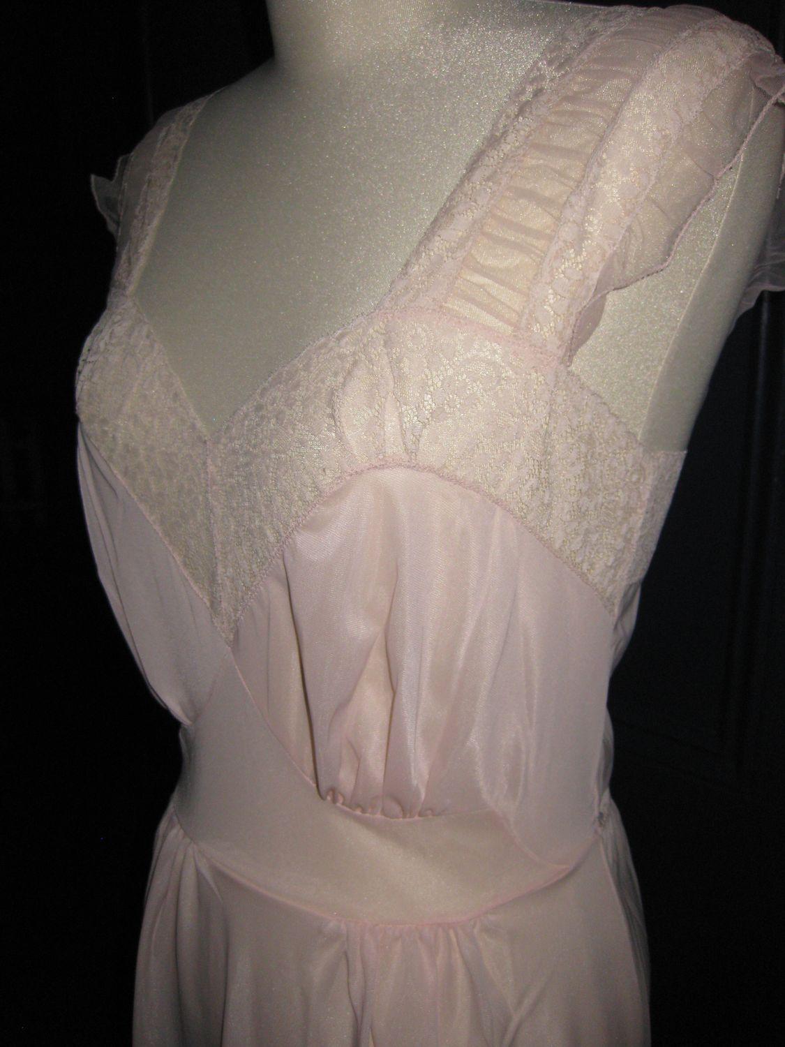 DescriptionLight pink nightgown, cap sleeves, v-neck, lace top (from waist) with floral stitching, upside down "v" ribbon under bust, long floor length skirt, accordion folds on skirt, elastic waist.