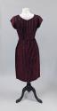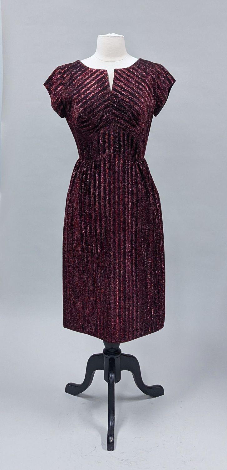DescriptionRed and black lame sleeveless dress, v slit neckline.