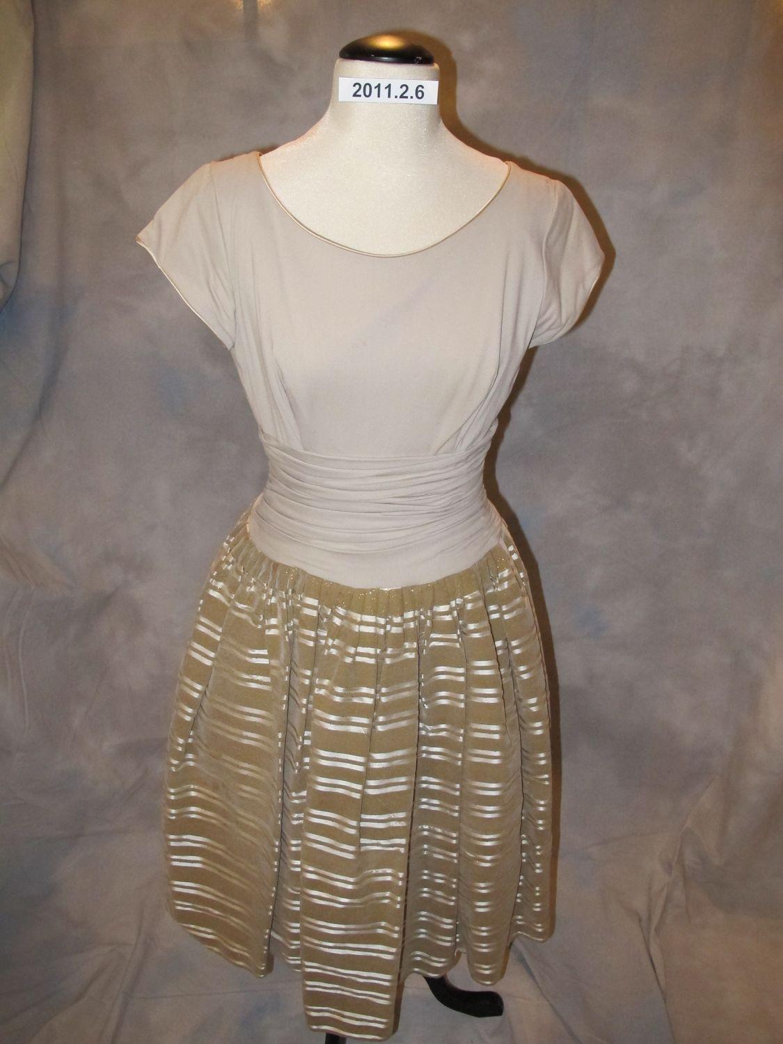 Beige and gold dress, scoop neck, short sleeves, cream satin bands on skirt.