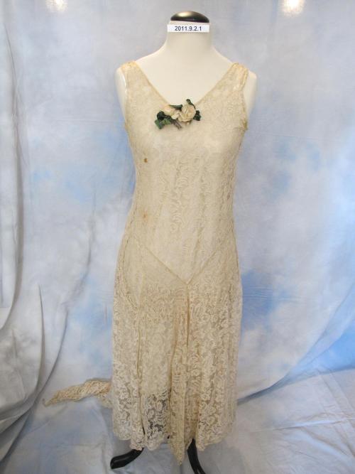 DescriptionWedding dress, ecru lace, asymmetrical hem, double pointed train, appliqued roses on back, attached florals, satin lining.