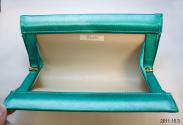 DescriptionDyed green satin clutch purse, grey leather interior.
