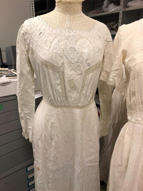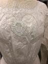 White lace tea dress, high neckline, floral embroidery and eyelet details.