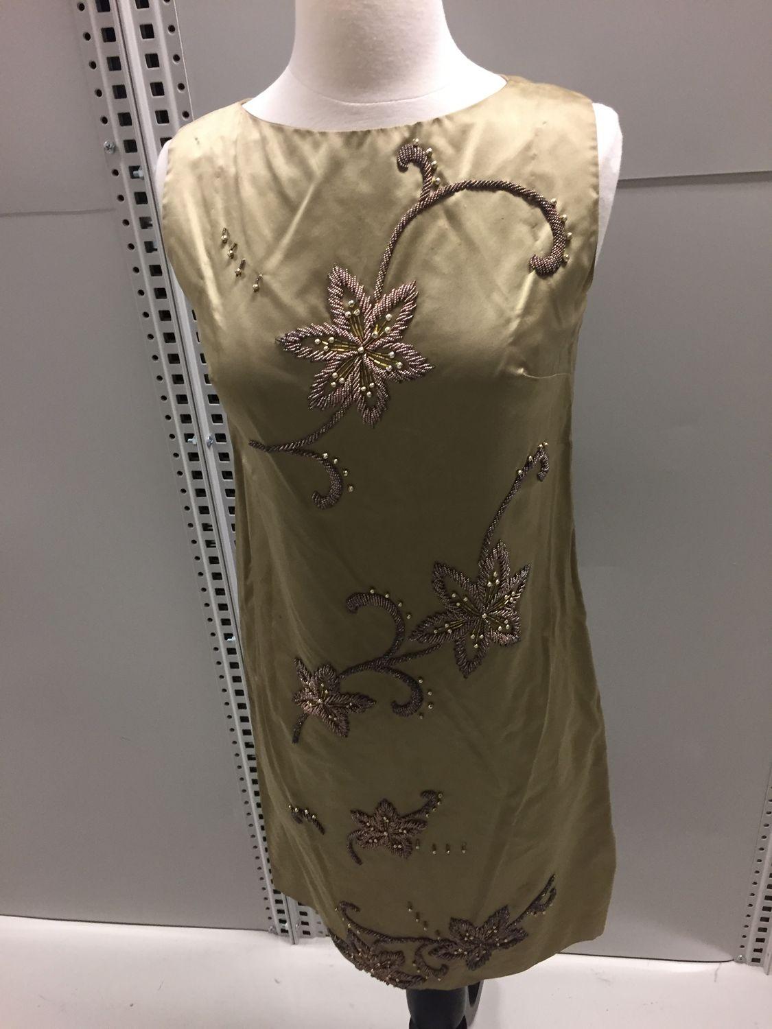 Gold satin shift dress with floral bead work.