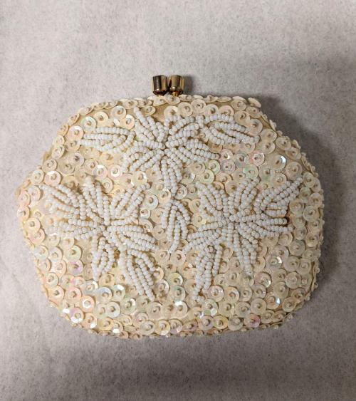 Cream beaded change purse with all over floral sequins and beads, keychain attached.