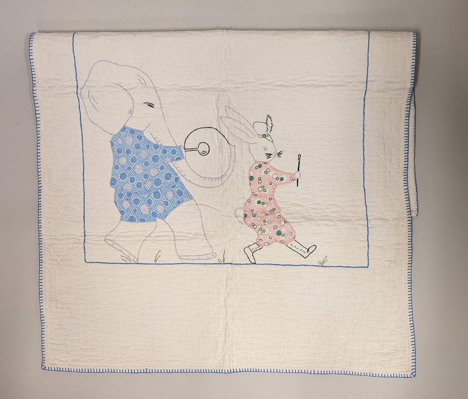 Quilted baby blanket with embroidered elephant and rabbit, stitched hem.