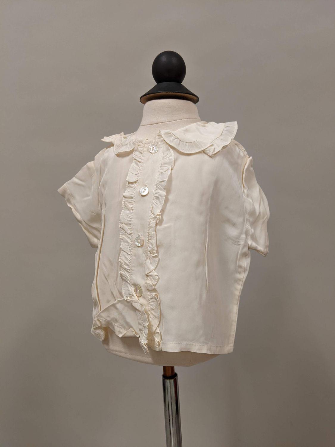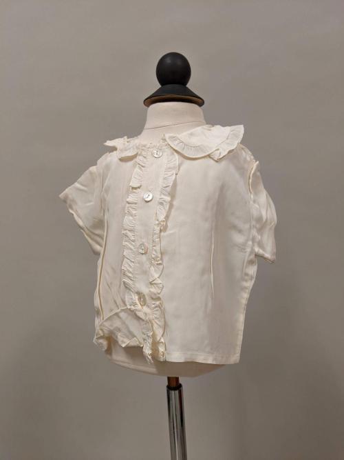 White baby shirt with ruffles down centre front, flounced collar.