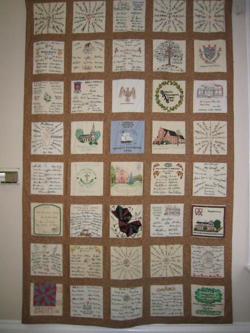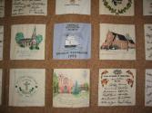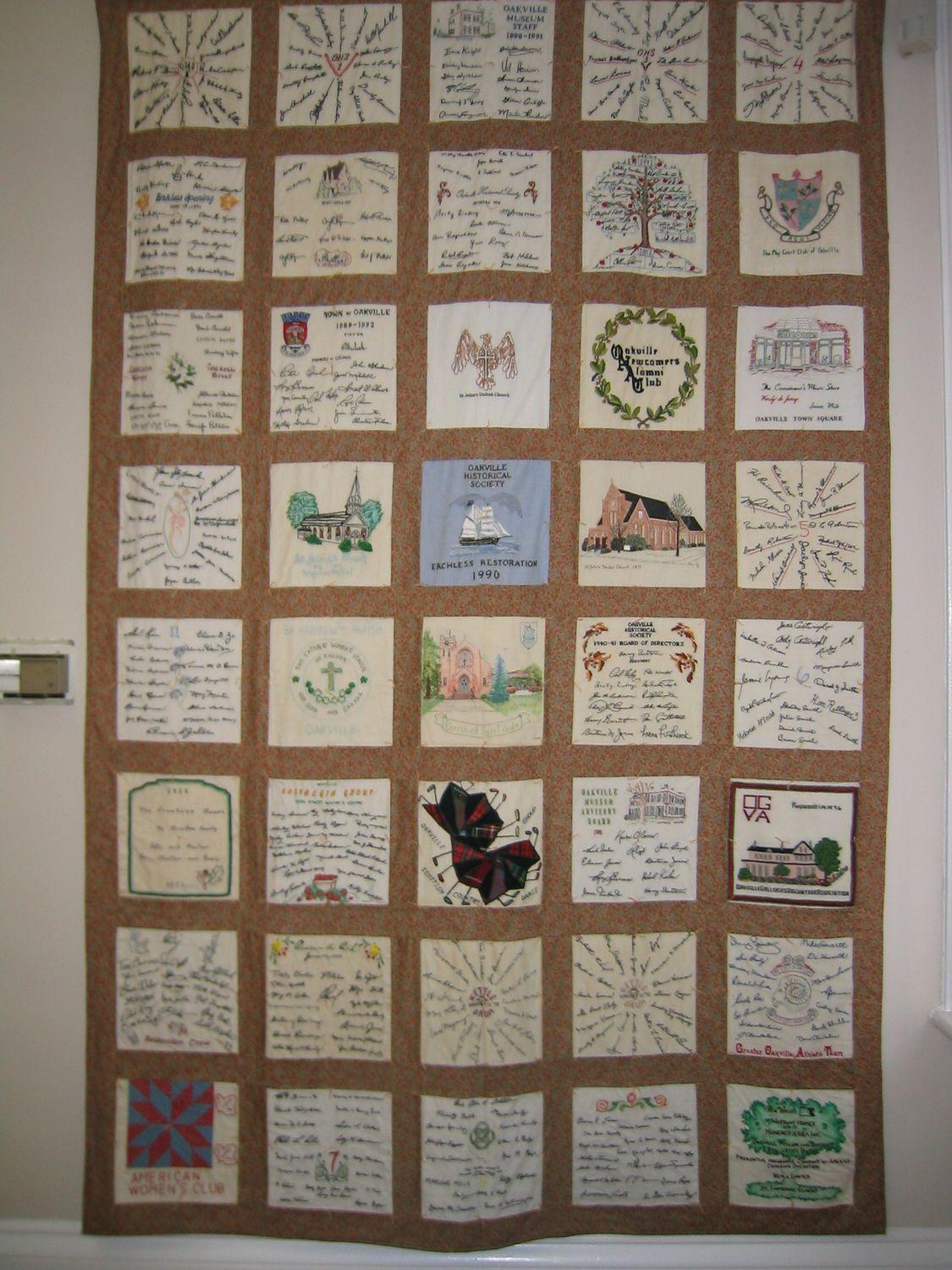 DescriptionSignature quilt with various stitched squares representing Oakville on brown backing.