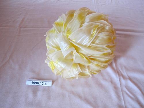 Yellow and cream hat covered in folded ribbon.