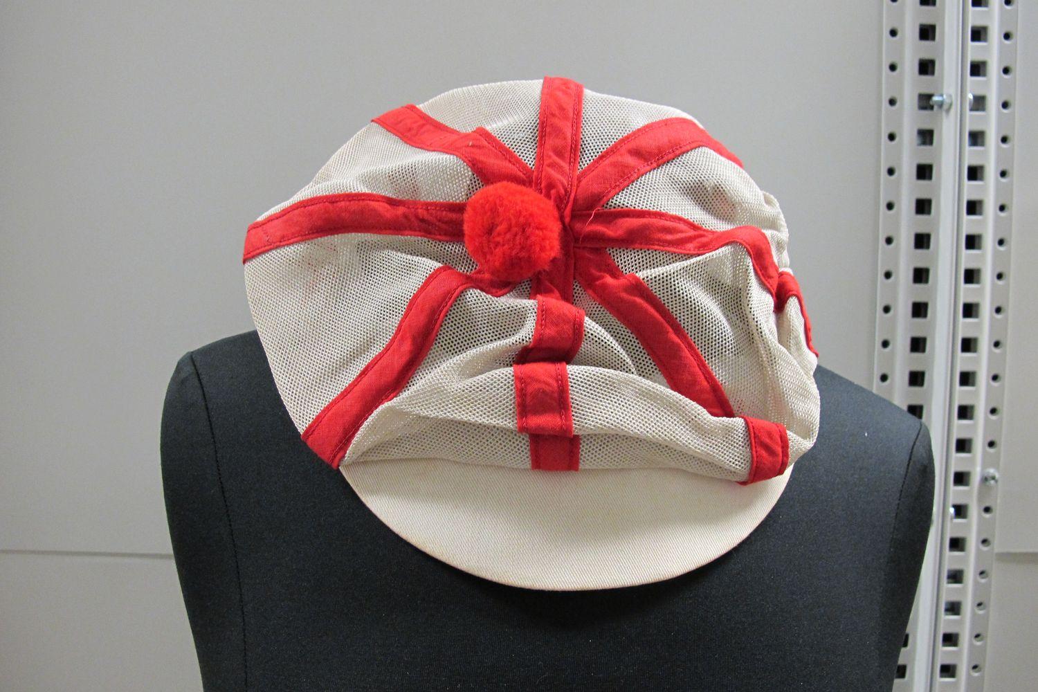 Beige mesh tam, beige brim, red striped tape, red pompom.