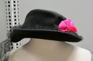 DescriptionBlack felt hat, cream, pink and blue flowers, black net.