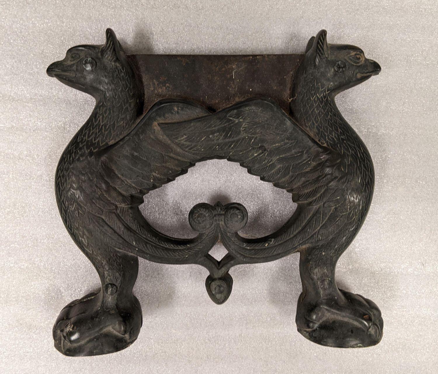 Metal boot scrapper with sculptural element of two birds facing away joined by wings and scraping blade.