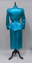 DescriptionDyed satin, turquoise spaghetti strap dress, floral beading, matching jacket, long puffed shoulders, belt with bow.