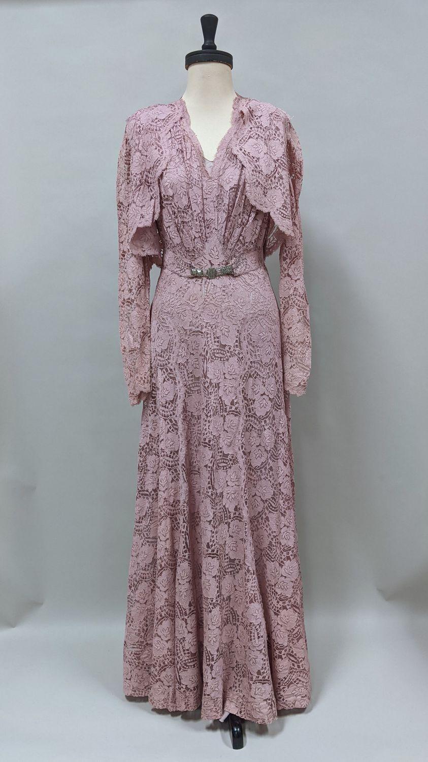 DescriptionDusty pink all over lace dress, matching bolero jacket, thin Art Deco inspired belt.