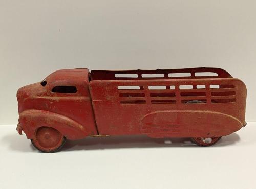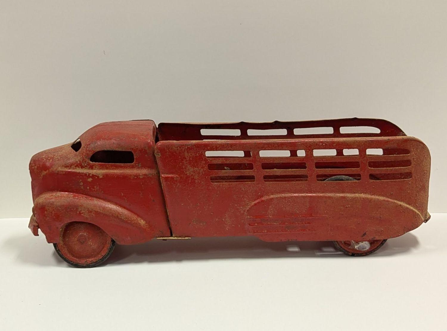 Red toy truck, metal.