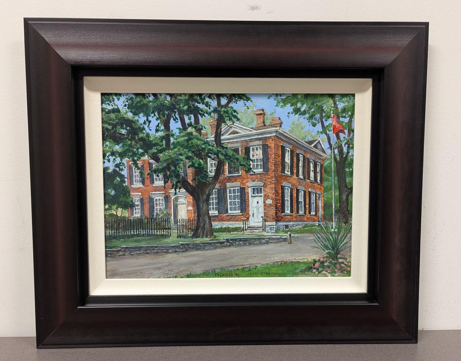 Label text:John Straiton graduated from Queens University in Arts in 1944 and was hired by Toronto-based advertising agency Spitzer Mills and Bates for his versatility with words and artistic abilities. In 1947, he married Helen Kemp in Toronto and they moved to Oakville in 1951 with their then two-year-old son Kenneth, and were joined, in 1952, by a daughter, Susan.