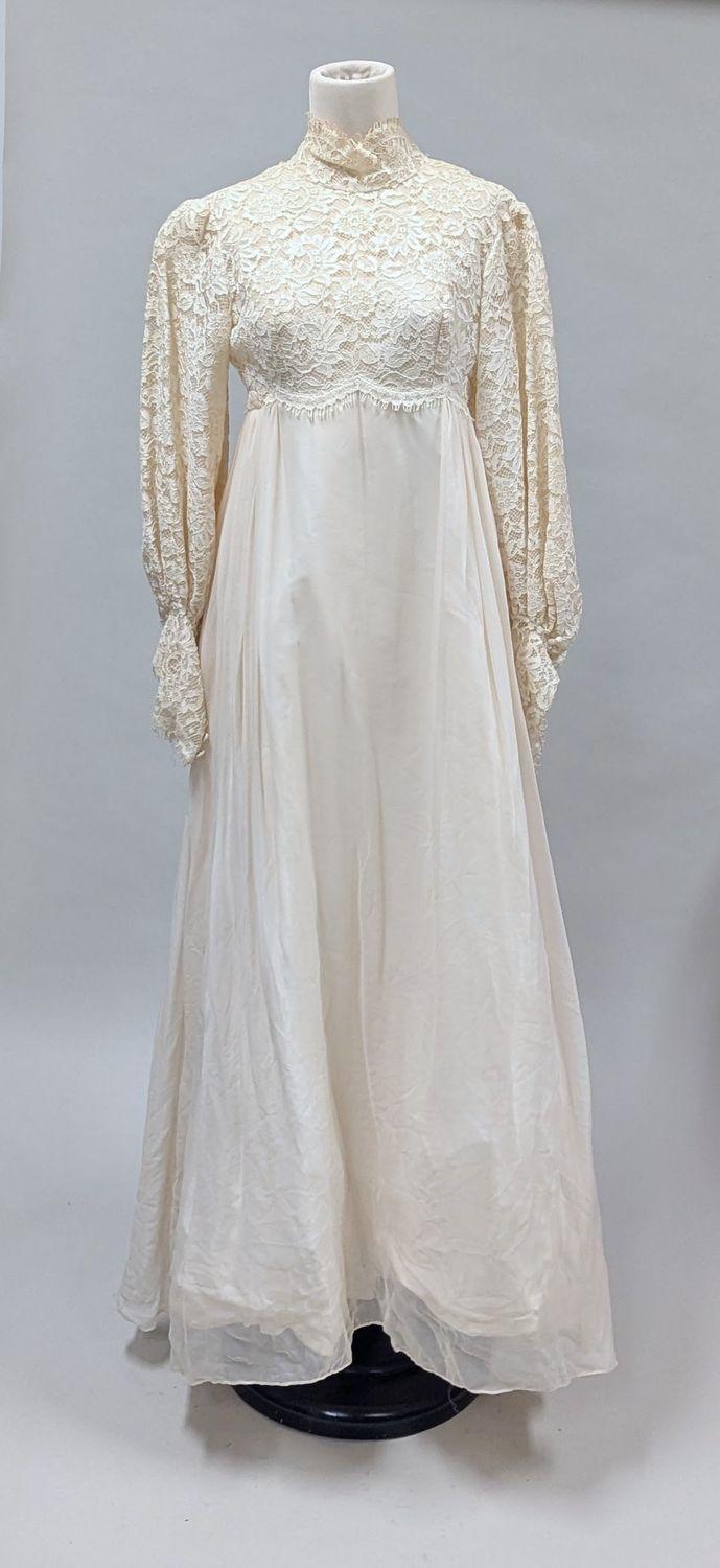 Cream lace and chiffon wedding gown, empire waist, long sleeves, high lace neckline and long sleeves, slight train, covered buttons at wrists.