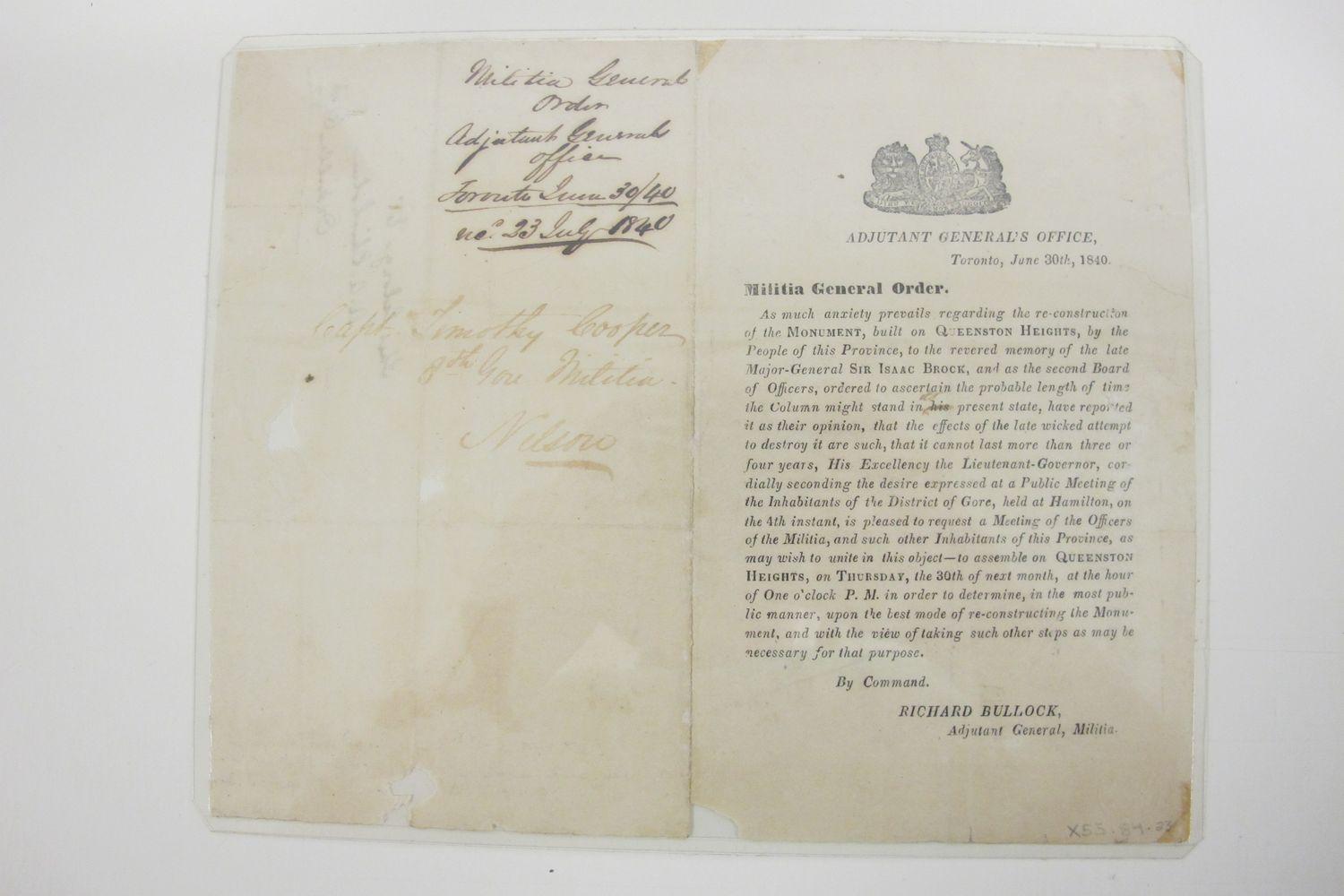 DescriptionPrinted Militia General Order; by command of Richard Bullock, Adjutant General, Militia; regarding the re-construction of the monument at Queenston Heights in the memory of Major-General Sir Isaac Brock; June 30, 1840; handwritten on left side of page (proper right of document) in light ink: Capt. Timothy Cooper 8th Gore Militia Nilsou; handwritten above in darker ink: Militia General Order Adjutant General's Office Toronto June 30/40 [no?] 23 July 1840;on back, handwritten in a corner: This belongs to A.A. Chisholm Oakville Ont.