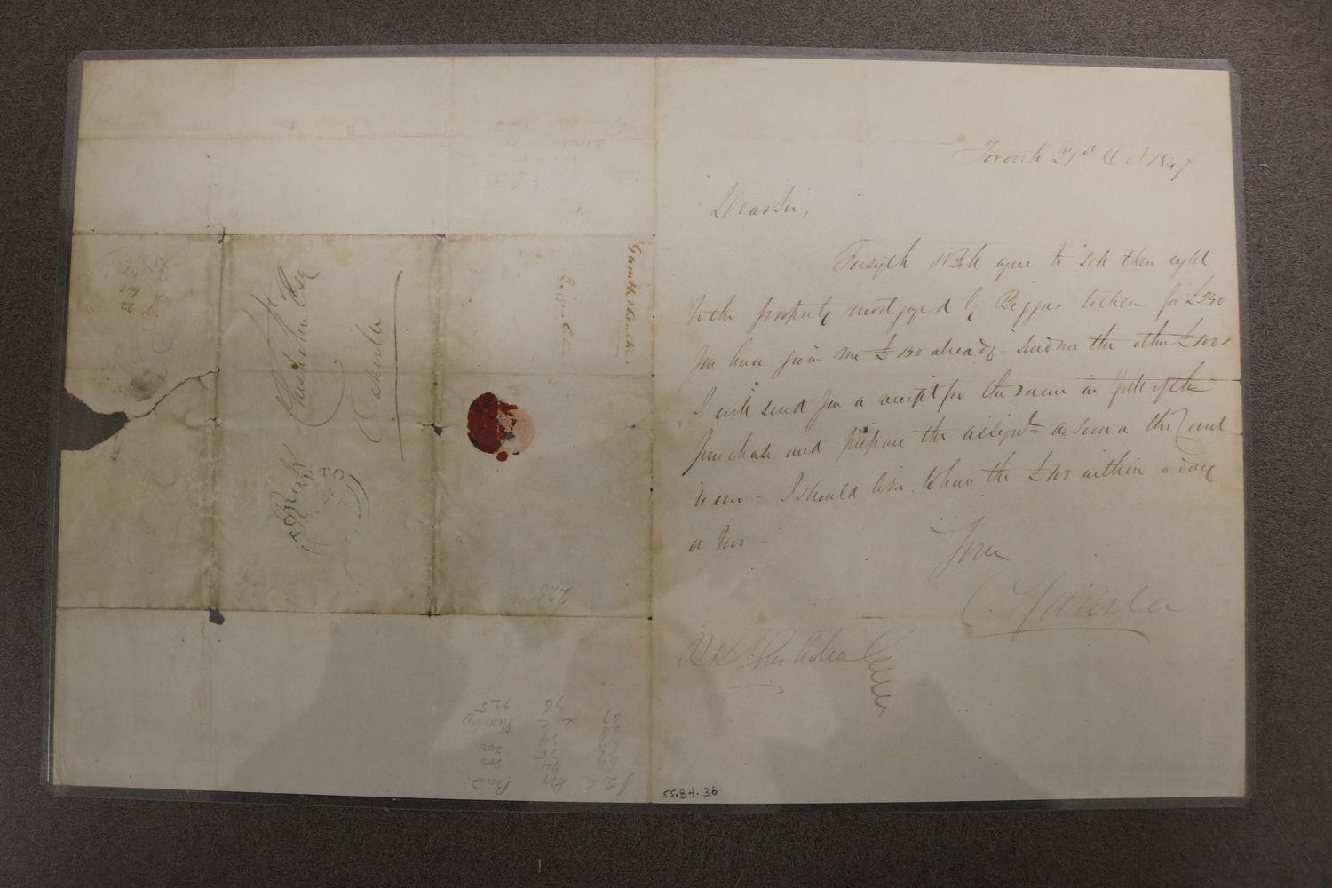 DescriptionLetter to R. K. Chisholm Esq. from Mr. Gamble; regarding payment for property; dated October 21, 1847.
