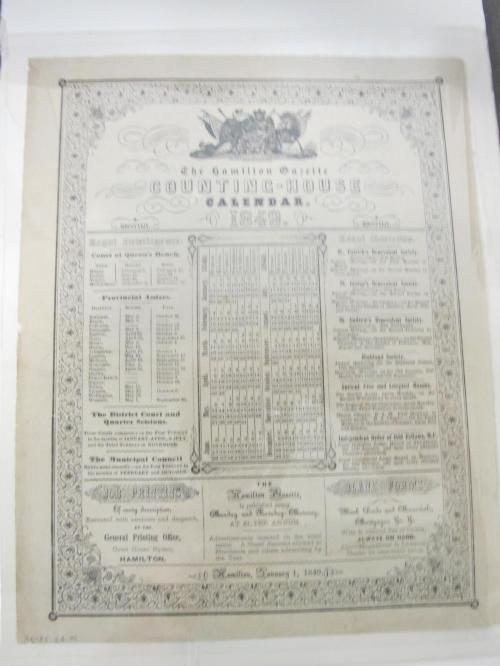 DescriptionCalendar; The Hamilton Gazette Counting House Calendar for 1849; gives the dates for holidays, provincial assizes, court sessions, municipal council meetings and local society meetings; printed January 2, 1849.