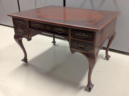 DescriptionWooden, rectangular partner's desk, large surface with oval inlay on top, 10 drawers total, 5 on each side of desk (2 on left, 2 on right, one longer drawer in centre), keyholes in all top drawers, brass handles, curved legs, castors.