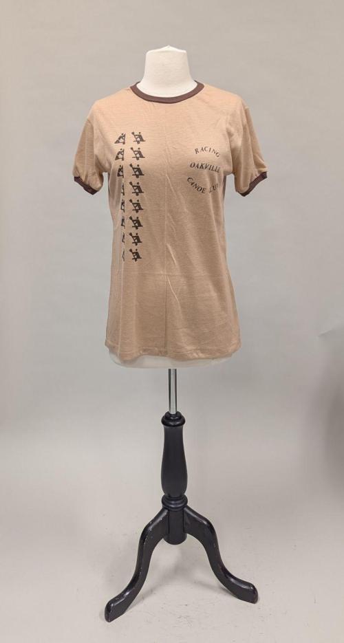 Racing Oakville Canoe Club Tee, tan with brown trim, graphic on front.