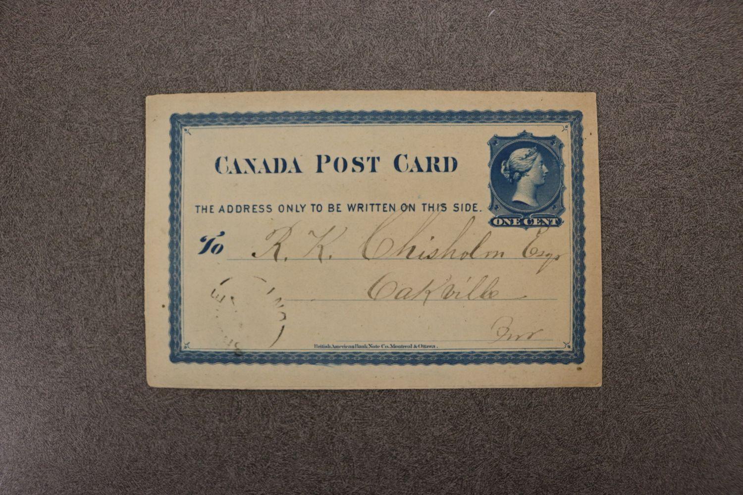 Postcard to R.K. Chisholm from C.K. Jones; about visiting Oakville; dated April 16, 1875.
