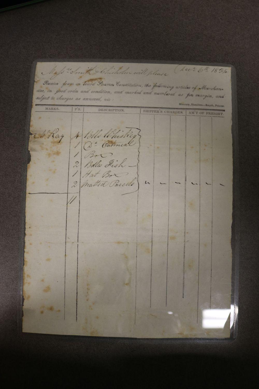 DescriptionReceipt for merchandise sent to Smith and Chisholm; from steamer Constitution; dated December 6, 1834; items include whiskey, oatmeal and a hat box.