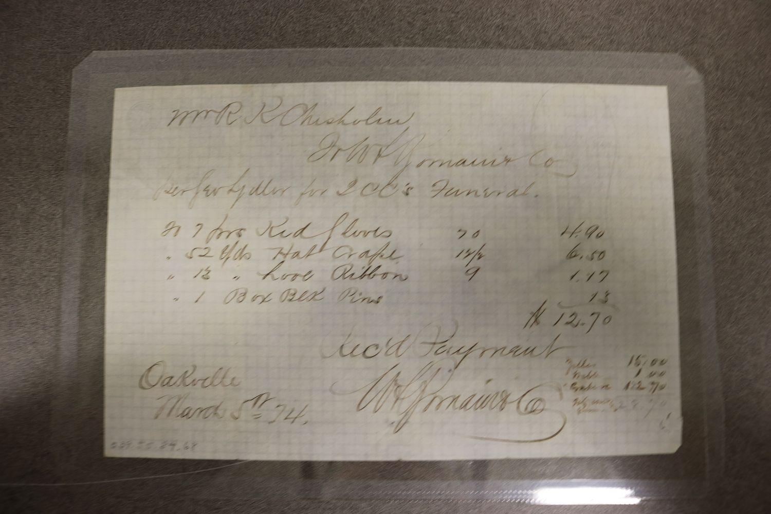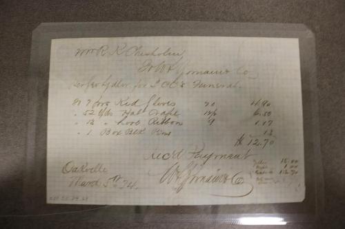 DescriptionHandwritten receipt on graph paper; for flower arrangement(s) for funeral; Romain & Co.; addressed to R.K. Chisholm; dated March 5th, 1874.