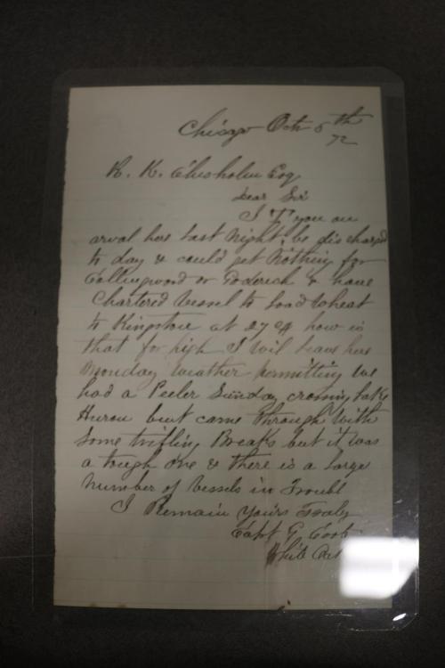 DescriptionHandwritten letter by G. Coote; Master of the schooner White Oak; to R.K. Chisholm; 1872.