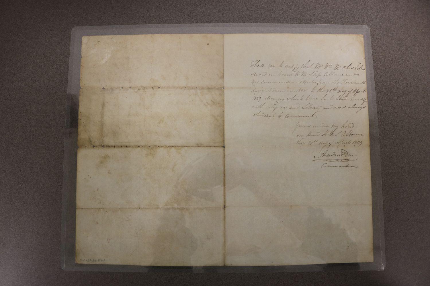 DescriptionCertificate of service; certifying that William Chisholm served upon the H.M.S. Colborne; issued by Andrew Dean, Commander of the H.M.S. Colborne; March 21, 1839.
