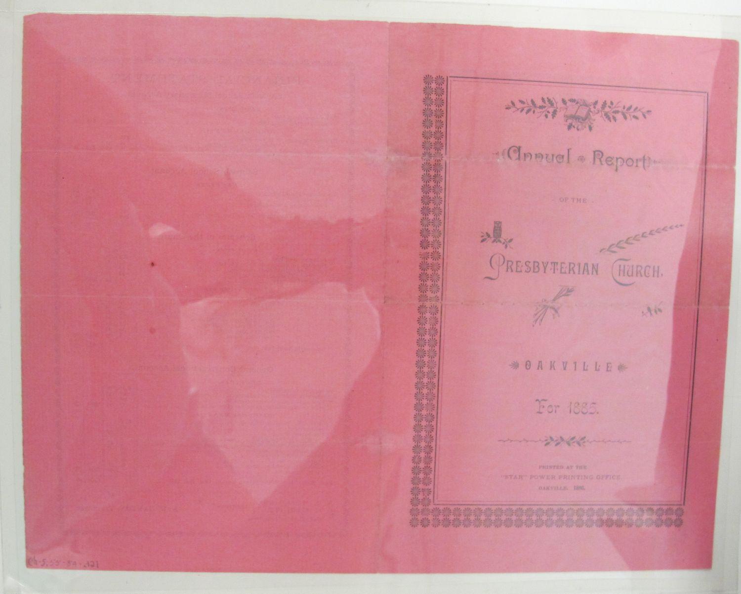 DescriptionAnnual report of the Presbyterian Church of Oakville for 1885; printed on pink paper.