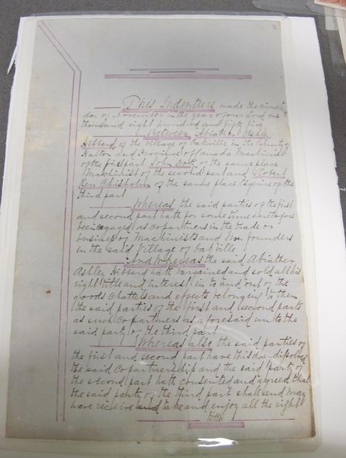 DescriptionBill of sale; for A.A. Hibberd’s share of a partnership in the foundry; sold to Robert Kerr Chisholm; dated November 19, 1855; signed by A. Hibberd, John Doty and witnessed by Robert Wilson, Solicitor; on the back is a copy of the dissolution agreement between John Doty and R. K. Chisholm; dated 1863.
