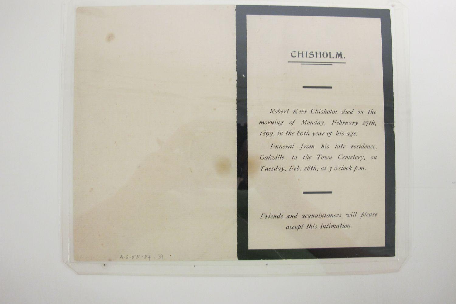 DescriptionPrinted obituary notice for R.K. Chisholm; February 27, 1899; black border.