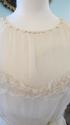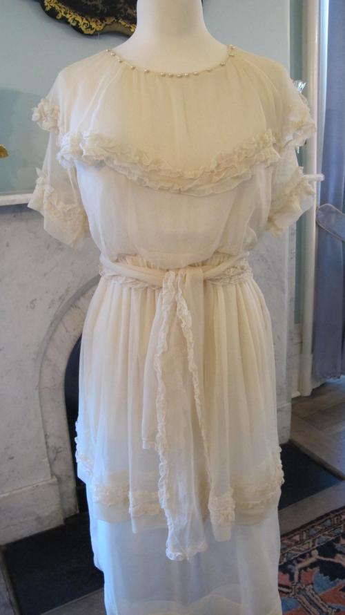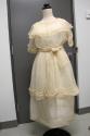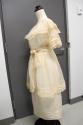 DescriptionCream crepe dress with underskirt intact, “pearls” on collar around neck, detachable belt ties at back.