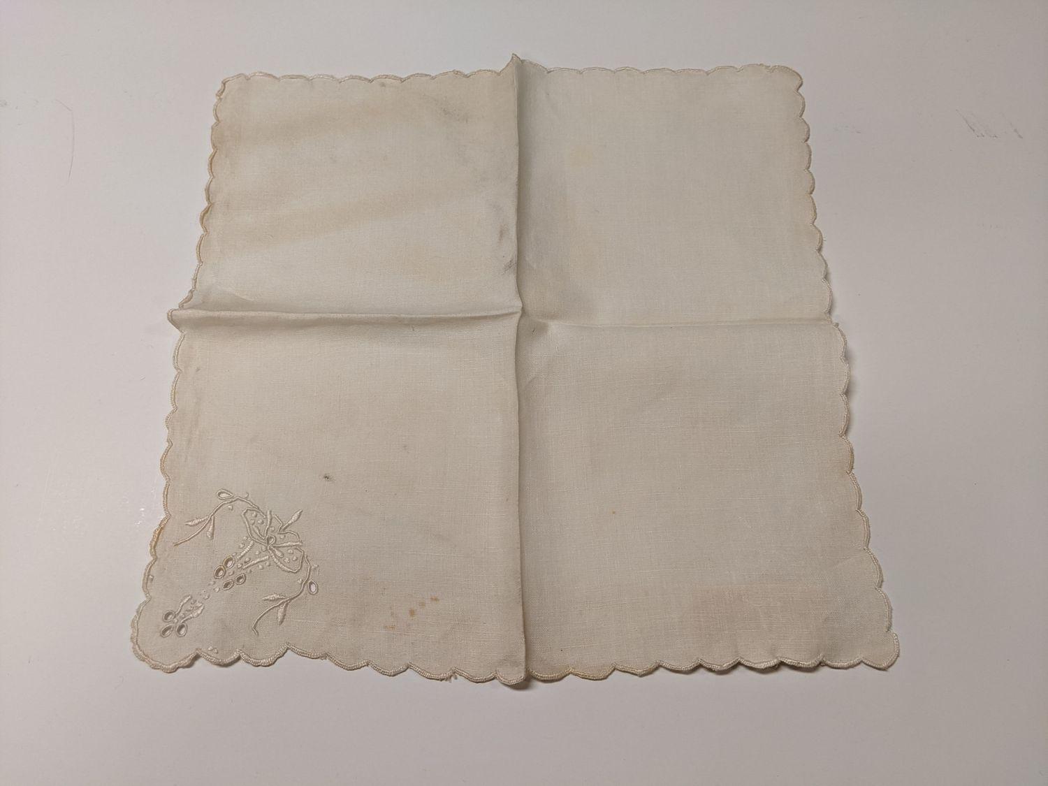 White lawn handkerchief with white satin stitch embroidery of organic motif in one corner; scalloped edges.