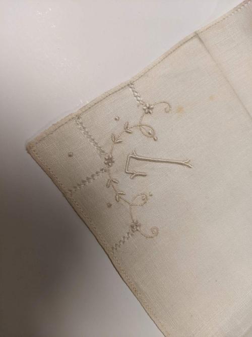 White lawn handkerchief with white satin stitch embroidery in one corner in a “L” and flower motif.