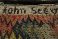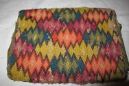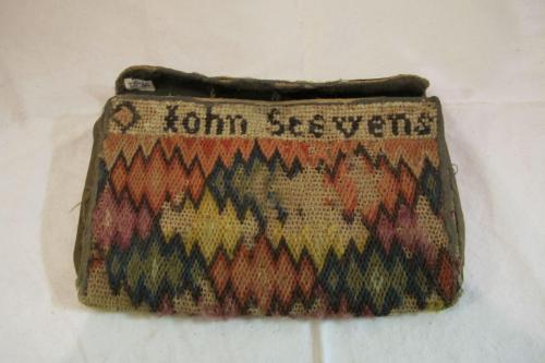 Purse, multi-coloured wool yarn in flame stitch, lined with green silk, three compartments on inside.