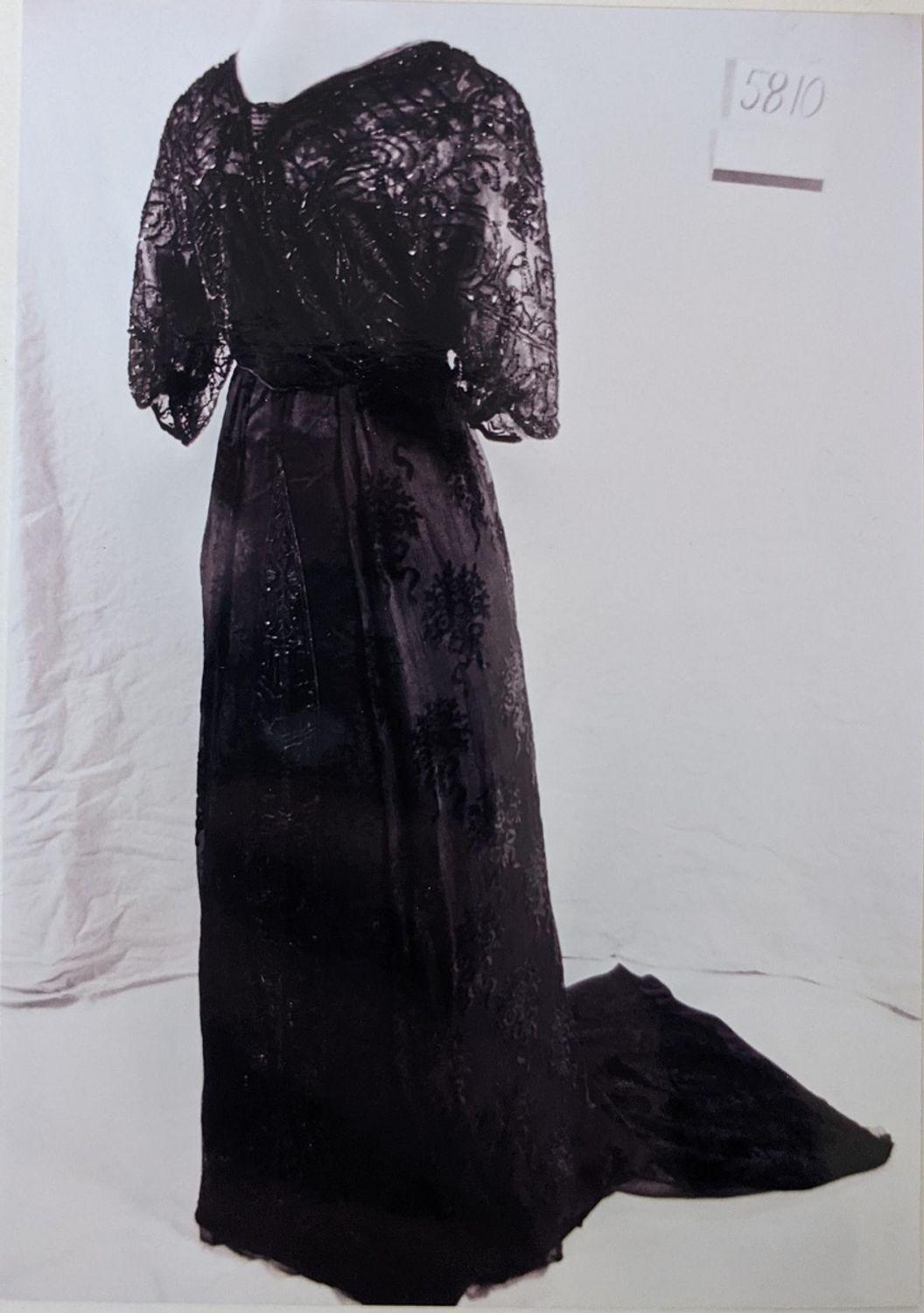 DescriptionBlack chiffon dress with chenile designs over black satin, high waisted.