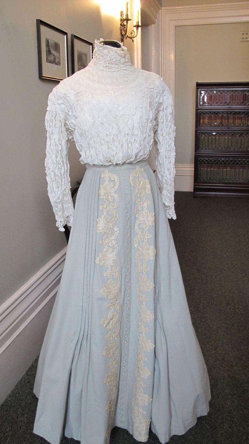 DescriptionGreen woolen skirt with ecru lace, pale green grey, band of crystal buttons down centre front, on either side of band cream silk appliques and 4 pleats, back pleat extends from back closure, small tarin.