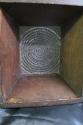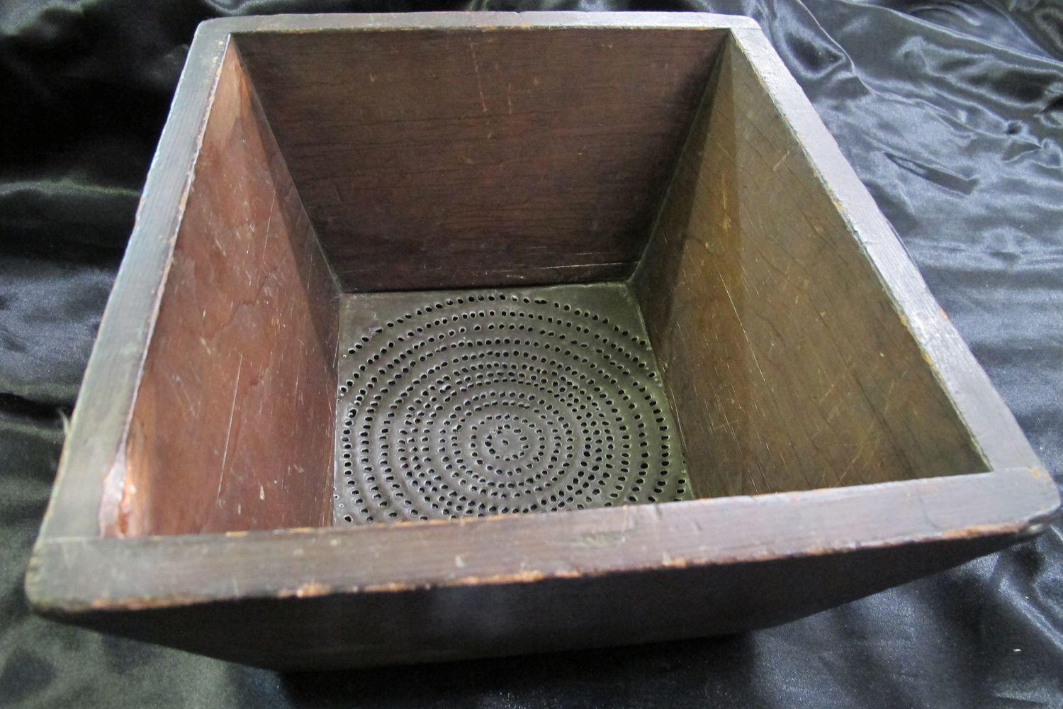 DescriptionLarge wooden and metal sieve, with flaring sides, base crudely punched holes in tin, sides wooden, attached at corners by dove tail joints.