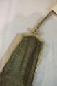 DescriptionGold cut steel mesh small purse, wider at bottom, 1 tassel, floral pattern metal frame, clasp set with blue stone, woven 'gold' mesh handle with 2 sides.