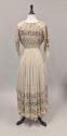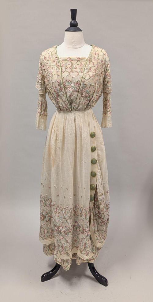 DescriptionBodice: V-neck to waist, insert, cap sleeves over longer sleeves edged with lace, gathered waist overskirt buttons up front, slightly shorter than dress. Satin stitch embroiderd floral design in pink and green.